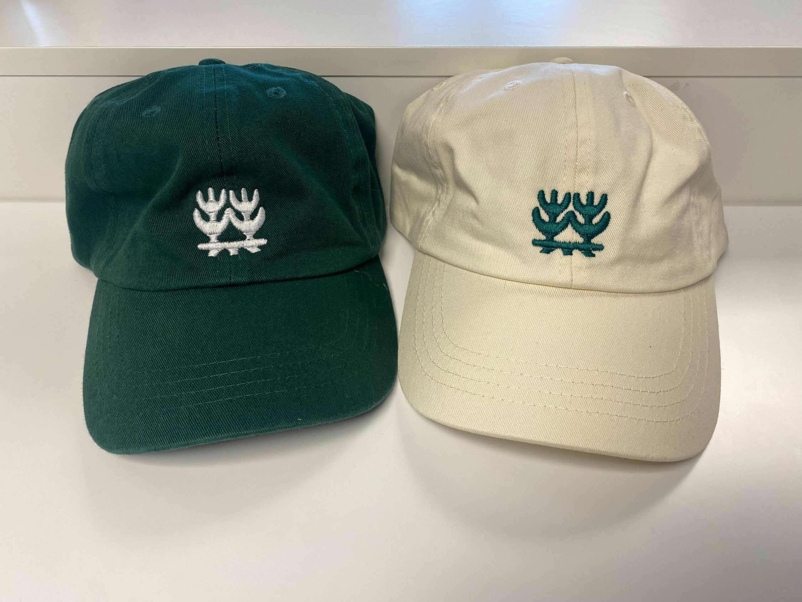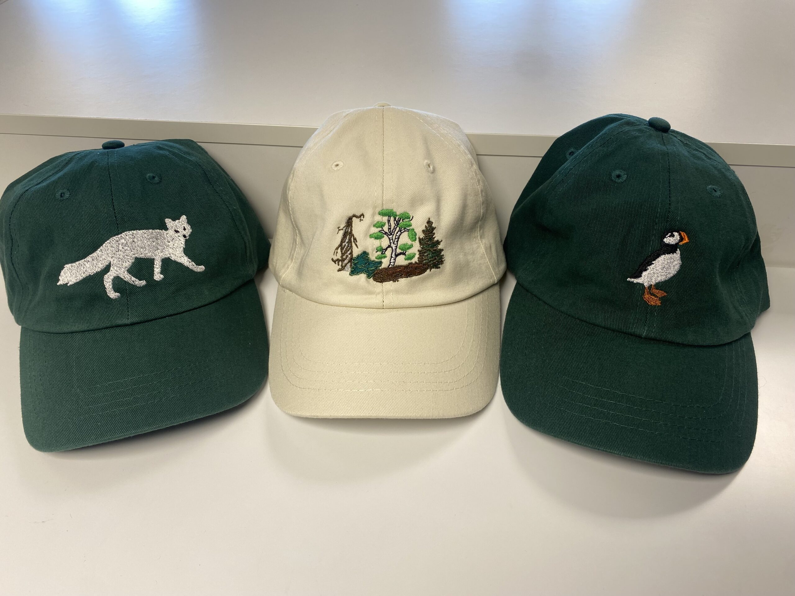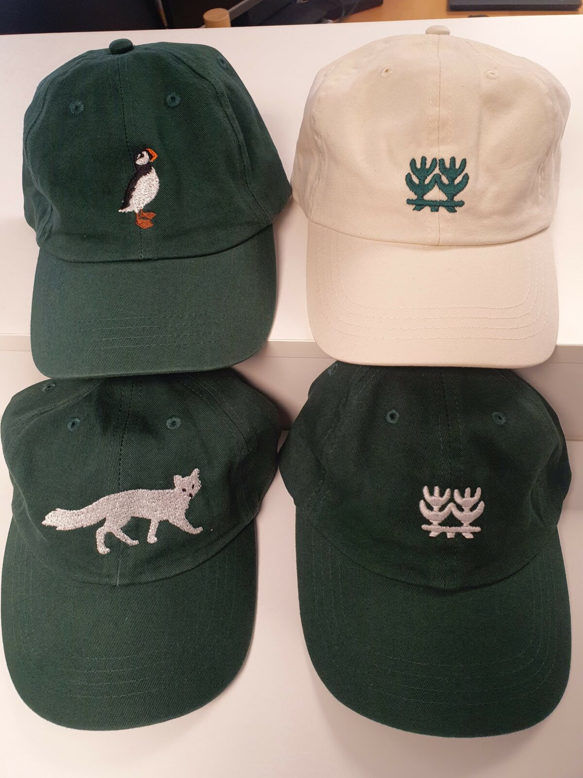 Broderte capser med logo, fjellrev, eller lundefugl foran. Alle capsene har "Naturvernforbundet" bak.