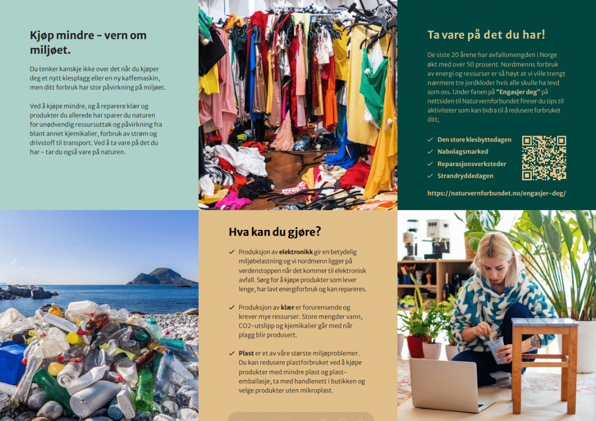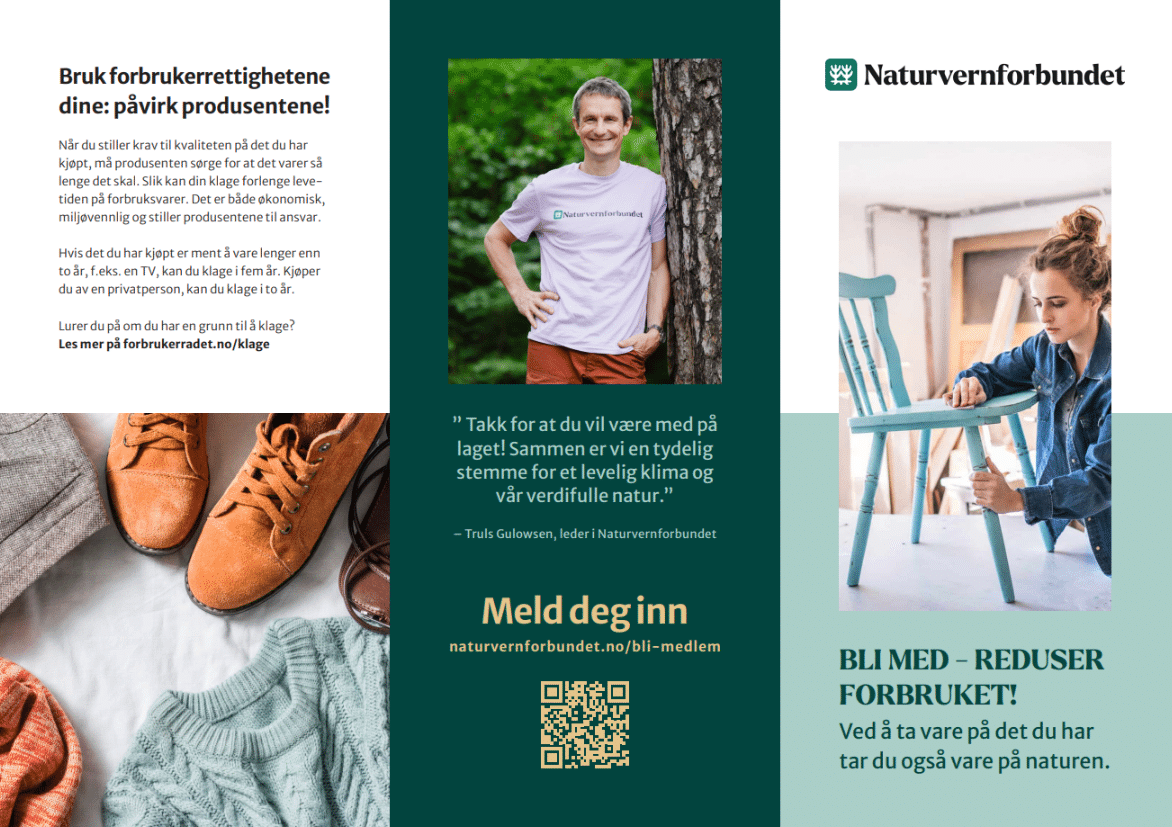 Folder "Reduser forbruket" med informasjom om Naturvernforbundet sitt arbeid med forbruk