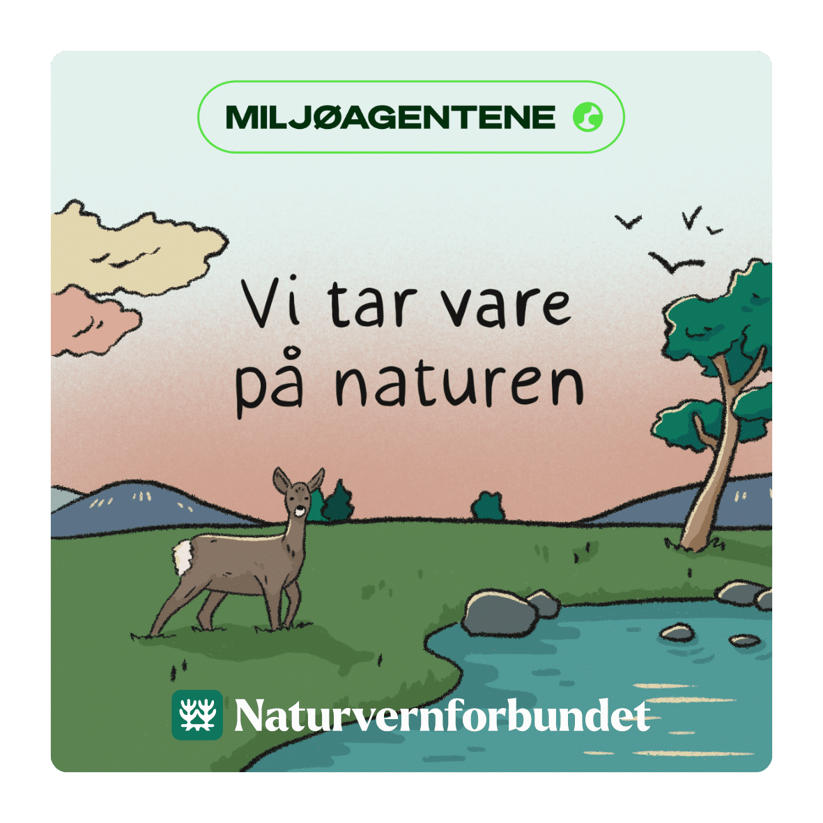 Klistremerke "Vi tar vare på naturen". Laget av Naturvernforbundet og Miljøagentene. Bestill antall mellom 20 og 200 klistremerker.