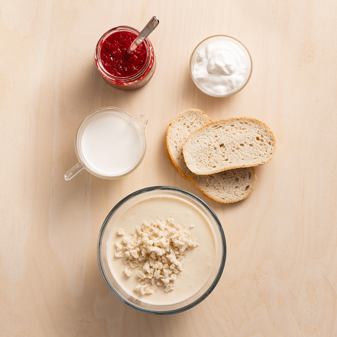 Putt skvettene og restene i en bolle. Tilsett egg – 3 egg per halvliter flytende. Så pisker du det sammen. Tilsett hvetemel, opprevet brød eller grøtrester til røra har en konsistens som minner om smeltet iskrem. Rør godt for å unngå klumper.