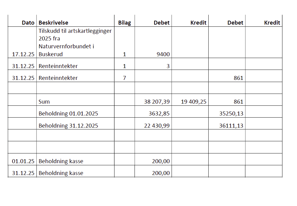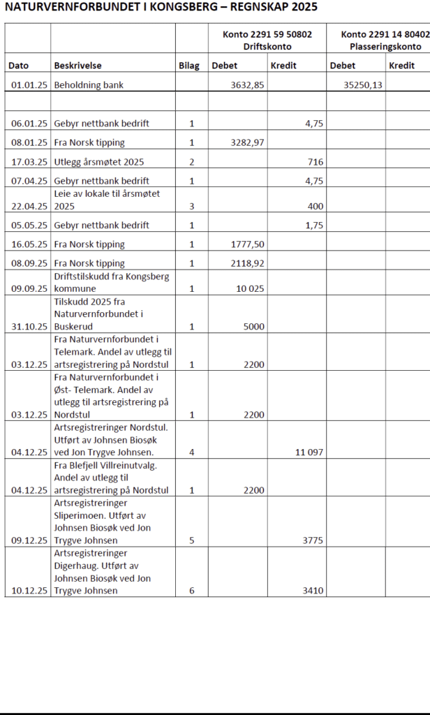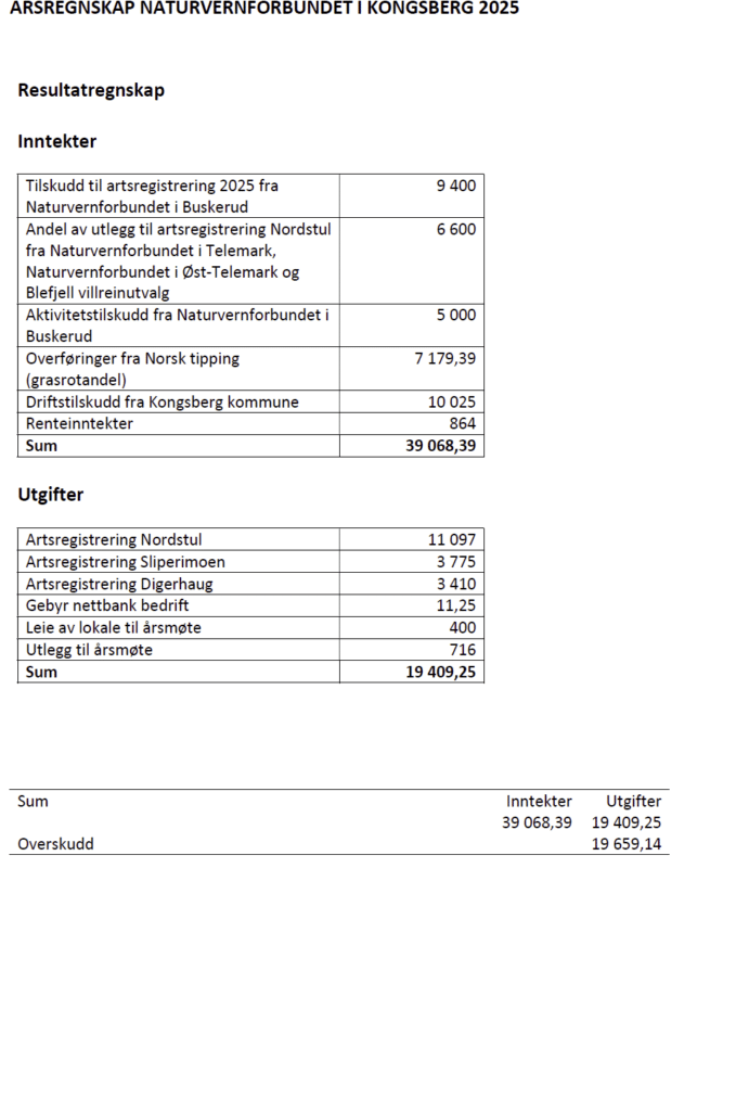 Årsmøtet i fjor vedtok følgende: «Naturvernforbundet i Kongsberg kan bruke inntil 10 000 av egenkapitalen til artskartlegging, men at det helst søkes om midler for å dekke inn utgiftene slik at egenkapitalen ikke reduseres.»