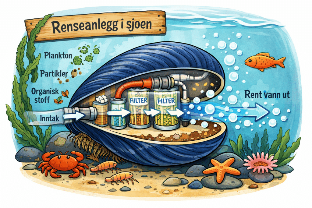 Når blåskjell filtrerer vannet, fjerner de partikler, planteplankton og organisk materiale – samtidig som skjellene skaper leveområder for smådyr som igjen blir mat for fisk.