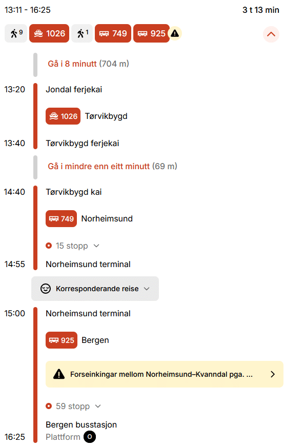 Retur: På søndag går kan du ta ferga fra Jondal til Tørvikbygd kl. 13.20, hvor du tar buss 749 videre. I Norheimsund terminal bytter du til buss 925, og er framme i Bergen 16.25.