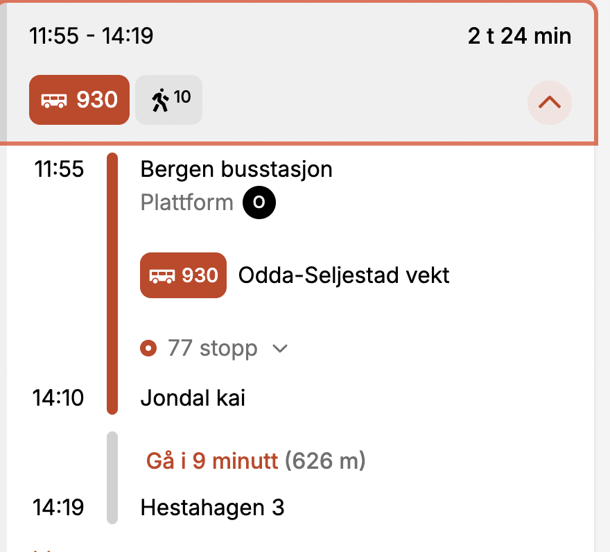 Tur: På fredag går buss 930 fra Bergen busstasjon plattform O kl. 11.55. Da er du fremme i Jondal kai 14.10. Og så en liten spasertur opp.