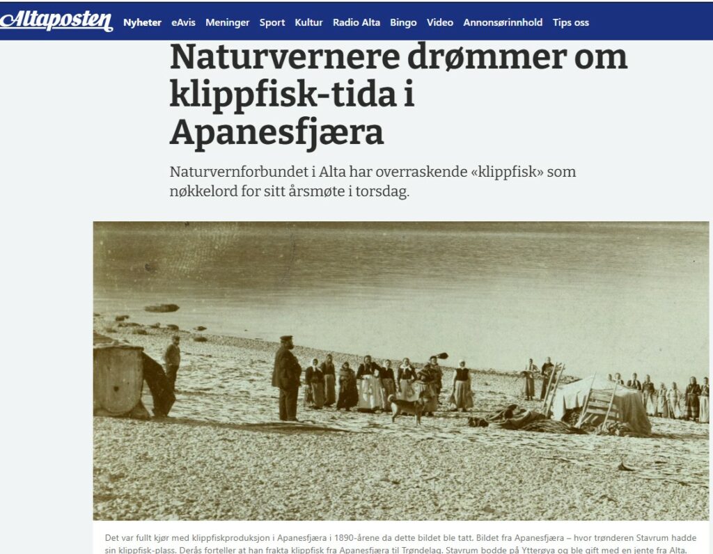 Historisk er det ingen tvil om at fjordene har hatt betydelig verdiskaping av tørrfisk, klippfisk og ferskfisk, som har vært svært viktig både lokalt og nasjonalt. Klippfisk-produksjonen i Apanesfjæra i Alta er bare et av mange eksempler. I Totalforsvarsåret 2026 må vi lære av historia, og det finnes mange beretninger om hvor viktig fisk var under 2. verdenskrig. Klarer vi å skape samarbeid mellom organisasjoner for å fremsnakke fjordene, med tanke på næringsutvikling som bygger på tradisjonene fra våre fjorder – fiske uten å ødelegge fjordenes ressurser? Et konkret eksempel for samarbeid er å støtte arbeidet med nominasjon av tørrfisk til UNESCOs liste over immateriell kulturarv, en sak som nylig har fått støtte i Fylkestinget i Finnmark.