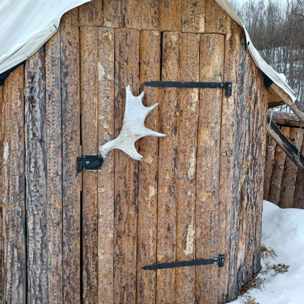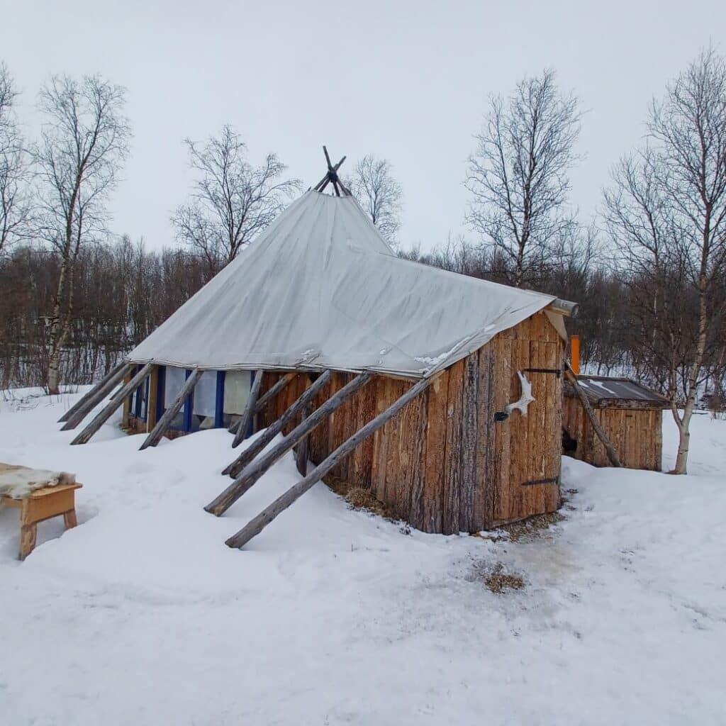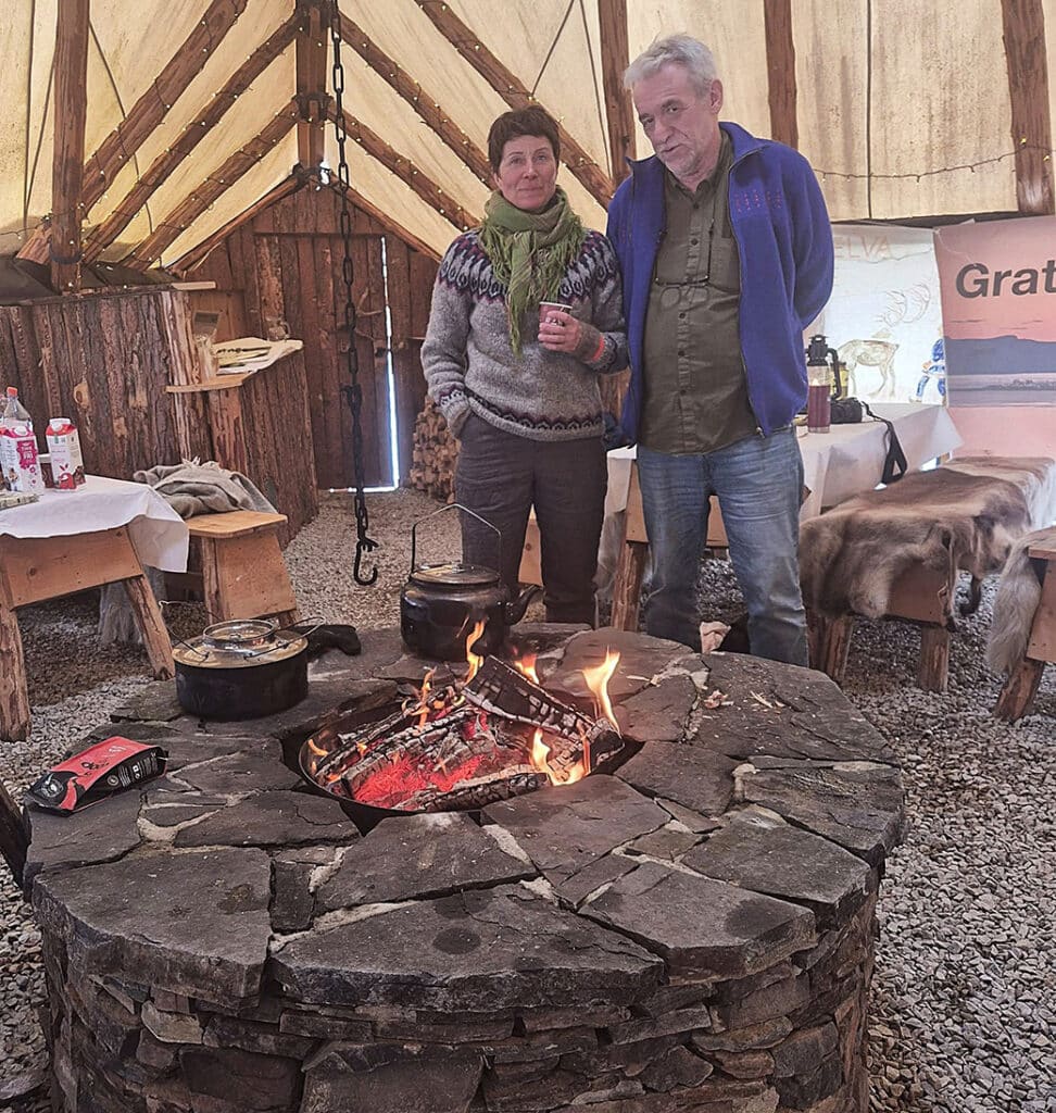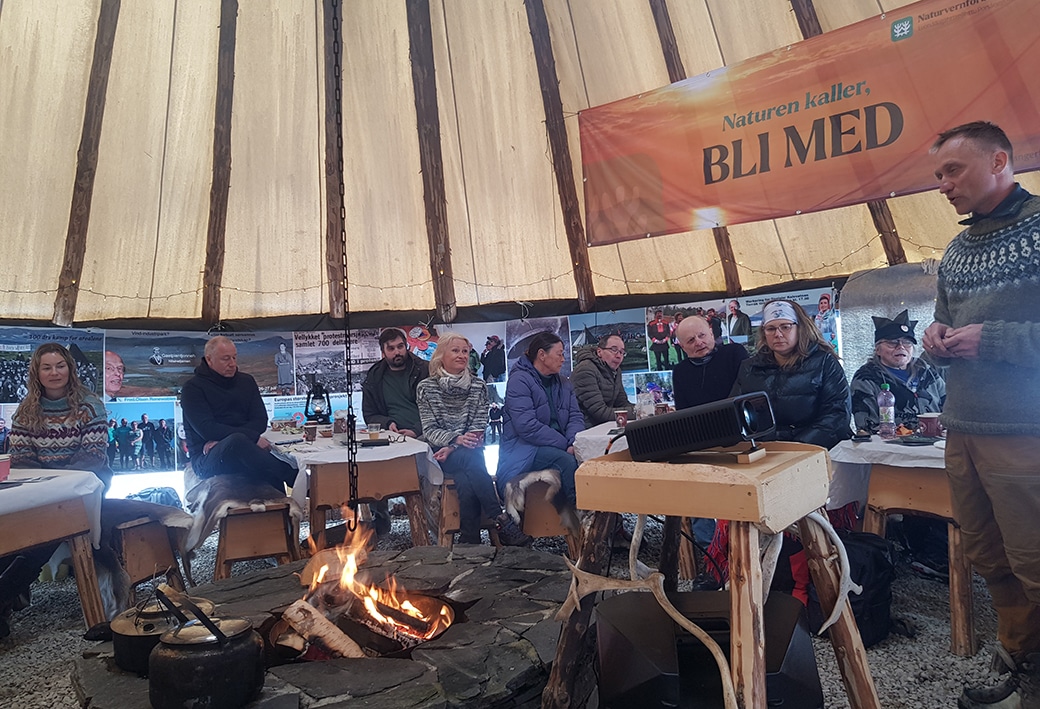 Bildet øverst: Noen av de oppmøtte på årsmøtet i Wild Caribou sitt møtelokale med bål, et unikt reiselivslokale bygd av gjenbruksmaterialer. Wild Caribou ble i 2021 godkjent som den 24. bedriften innen Norsk Økoturisme.
