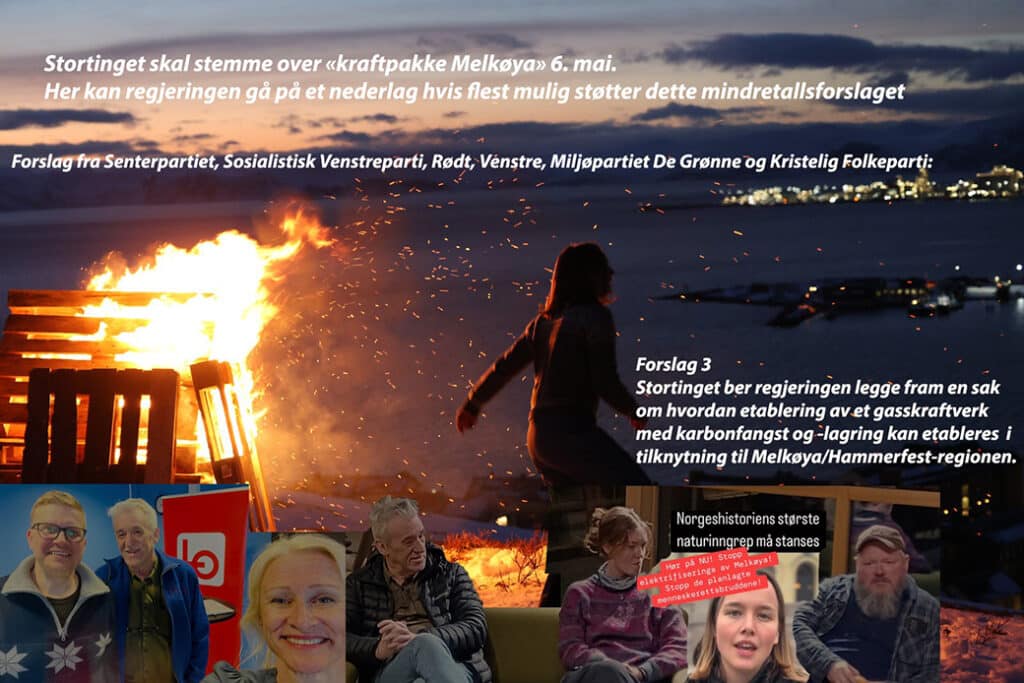 Først jobber vi for å få flertall 6. mai på Stortinget mot elektrifiseringa av Melkøya. Det er FrP som sitter på nøkkelen – støtter de mindretallsforslag 3 i Stortingets energi- og miljøkomité, så blir landstrømprosjektet avlyst og trusselen mot Finnmarks-naturen litt mindre. Om forslag 3: