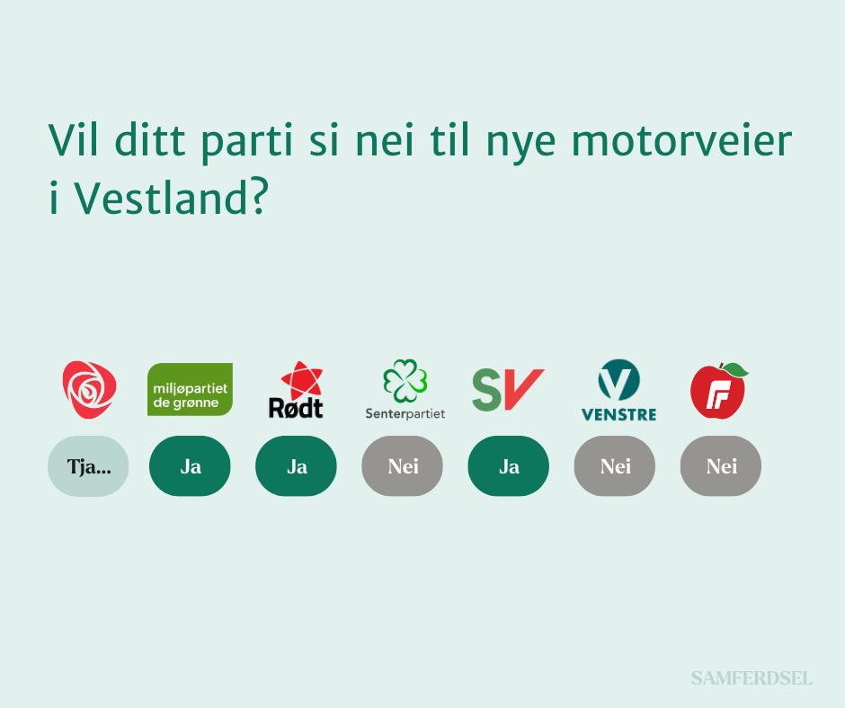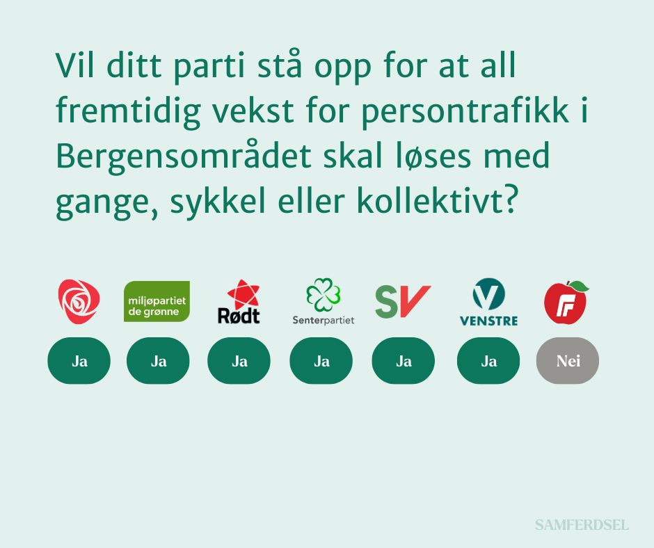 Når byene vokser, vokser persontrafikken også. Men hvordan skal dette håndteres? «Nullvekstmålet» er et uttrykk som beskriver at denne trafikkveksten ikke føre til mer biltrafikk fordi det vil skape mer kø, kork og kaos. Det har vært bred enighet om at det er klokt at veksten derfor skal tas med gange, sykkel og kollektivt. Vi mener at man må lære av våre feil med Sotrasambandet, for når man bygger ut veikapasiteten vil biltrafikken øke. Det er derfor relevant å se på hvordan partiene svarer om villigheten til å bygge motorveier, og bygge fire felts motorveier – fremfor to felt.