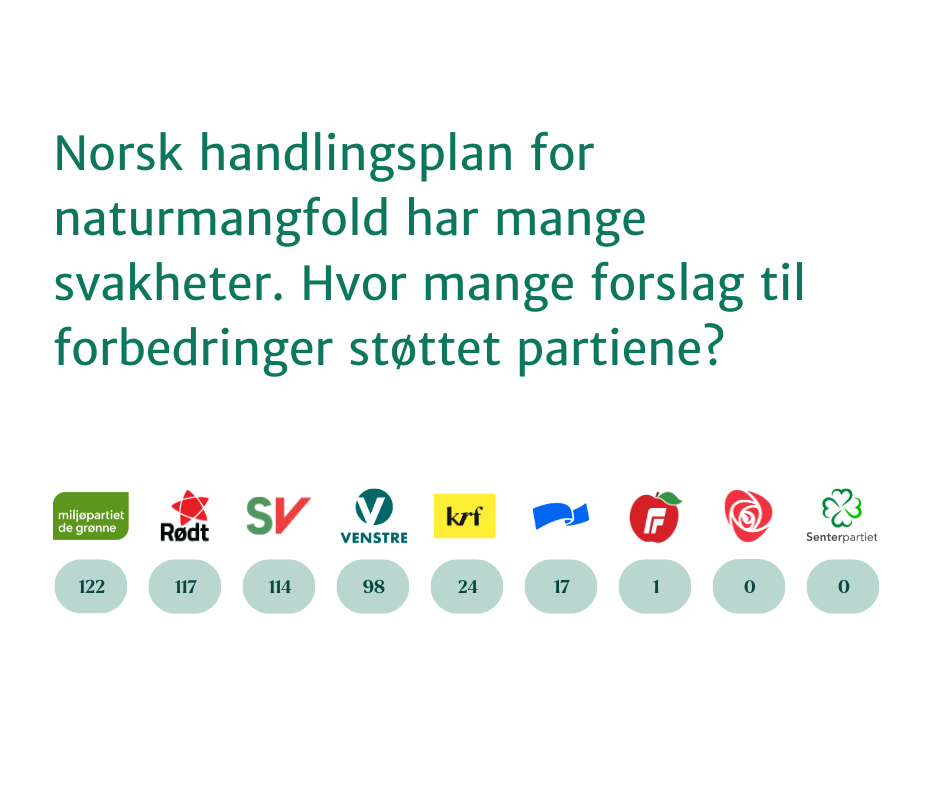 For et år siden kom stortingsmeldingen om hvordan vi skal bruke og bevare naturen. Det ble en stor skuffelse, for den var så å si uten konkrete handlinger. Forskere skrev et opprop mot den svake handlingsplanen, og vi var mange som foreslo måter den kunne forbedres. Hvor mange forslag støttet partiene?