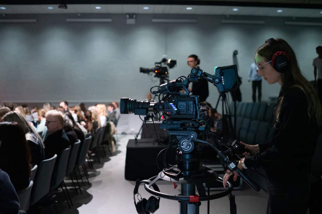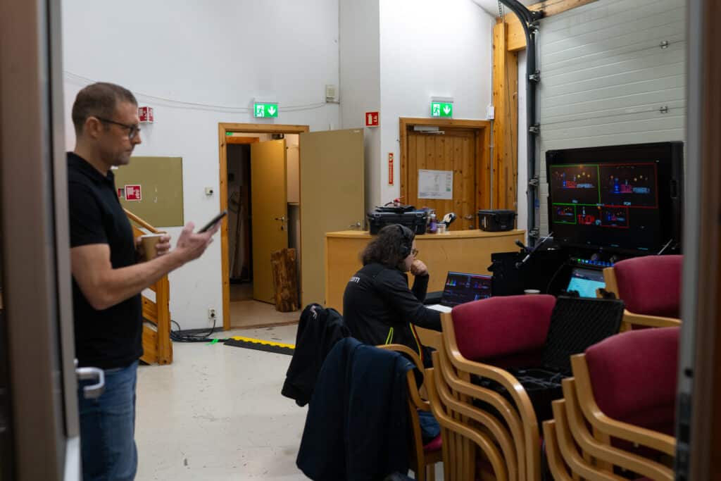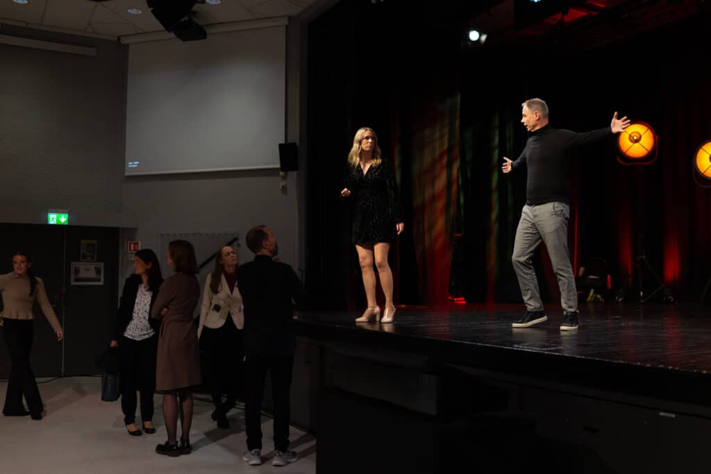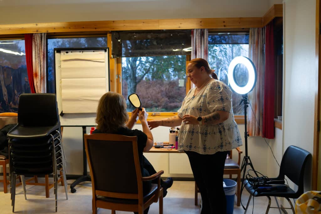 Lene traver rundt i lokalet, snakker med ordfører Tom Georg Indrevik, og forbereder seg til å lede oss gjennom dagen. Alle som skal stå på scenen er sminket, og her er det ingen tilfeldigheter. Den hvite kjolen måtte skiftes ut, for den ble lysende når de testet det ut foran kamera.