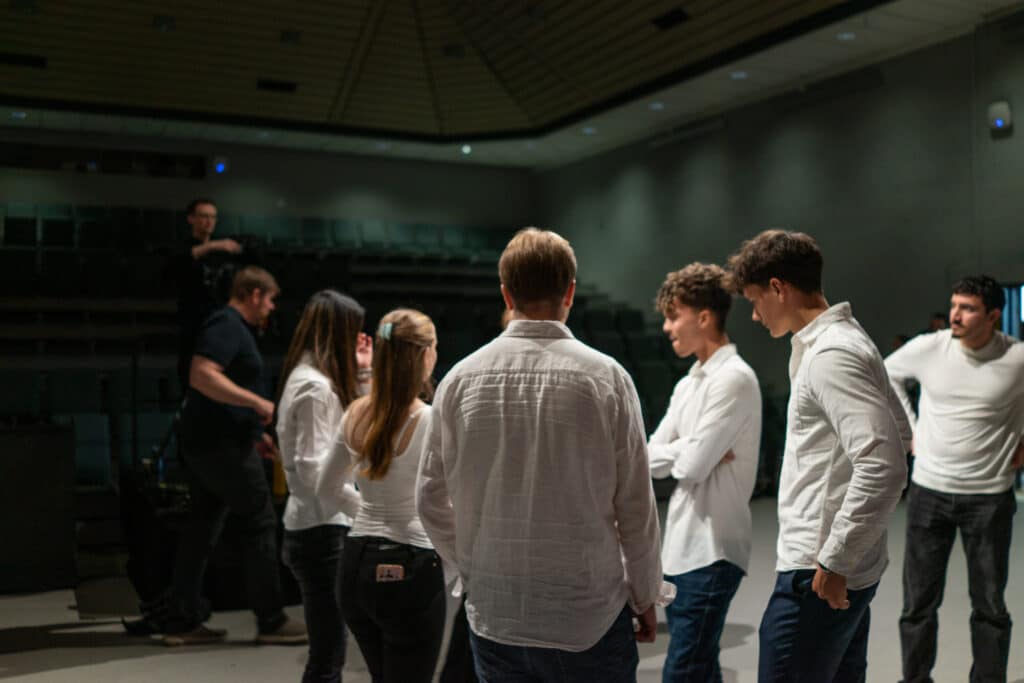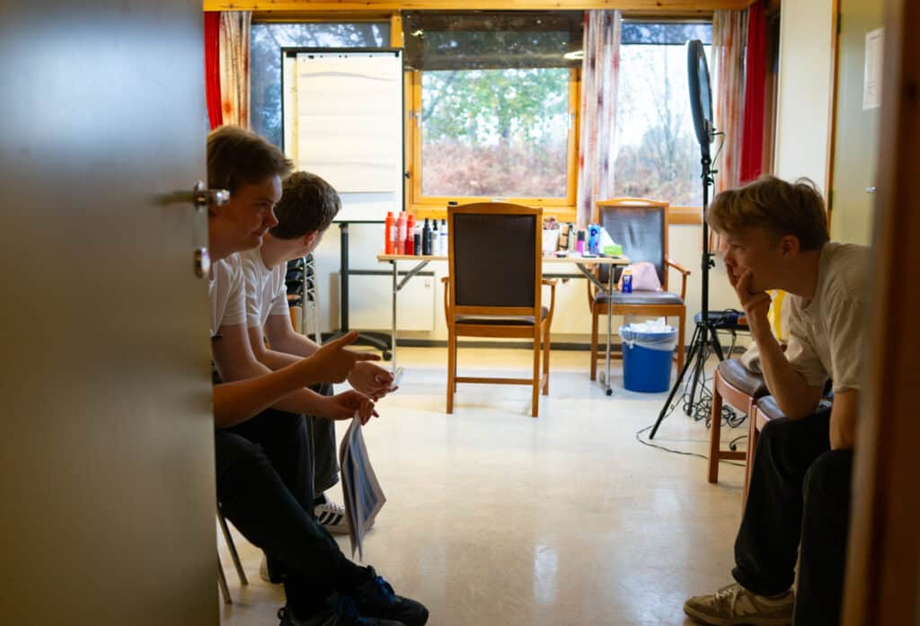 Flere av talerne øver seg på bakrommet og gjenforteller poengene de skal komme med på scenen. Sara Kristine Turøy er den yngste taleren, og hun ble utfordret av læreren sin til å delta.
