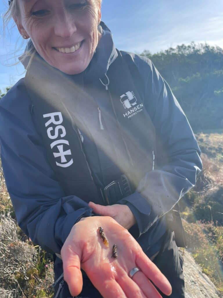 I 2025 er jeg tilbake. UiB er klar for ny ryddeinnsats, og mens de ivrig går i gang finner Marte Haave, hun som i sin tid tok initiativ til prosjektet her ute, to små vårfluelarve-hus.