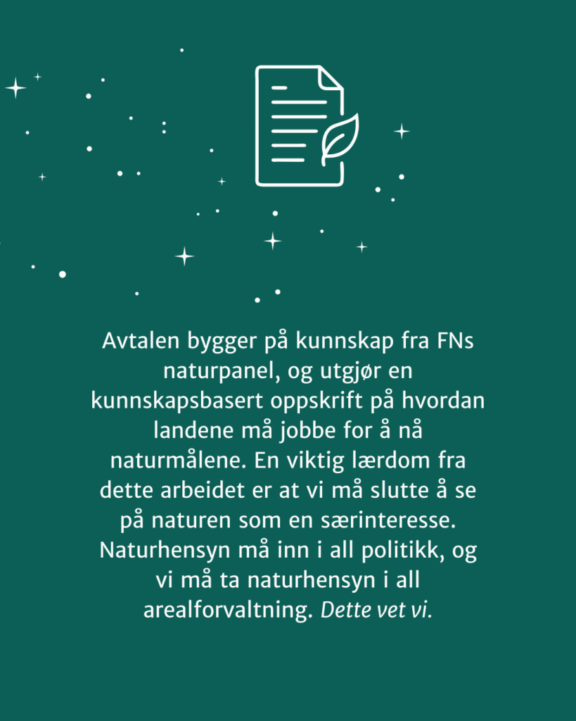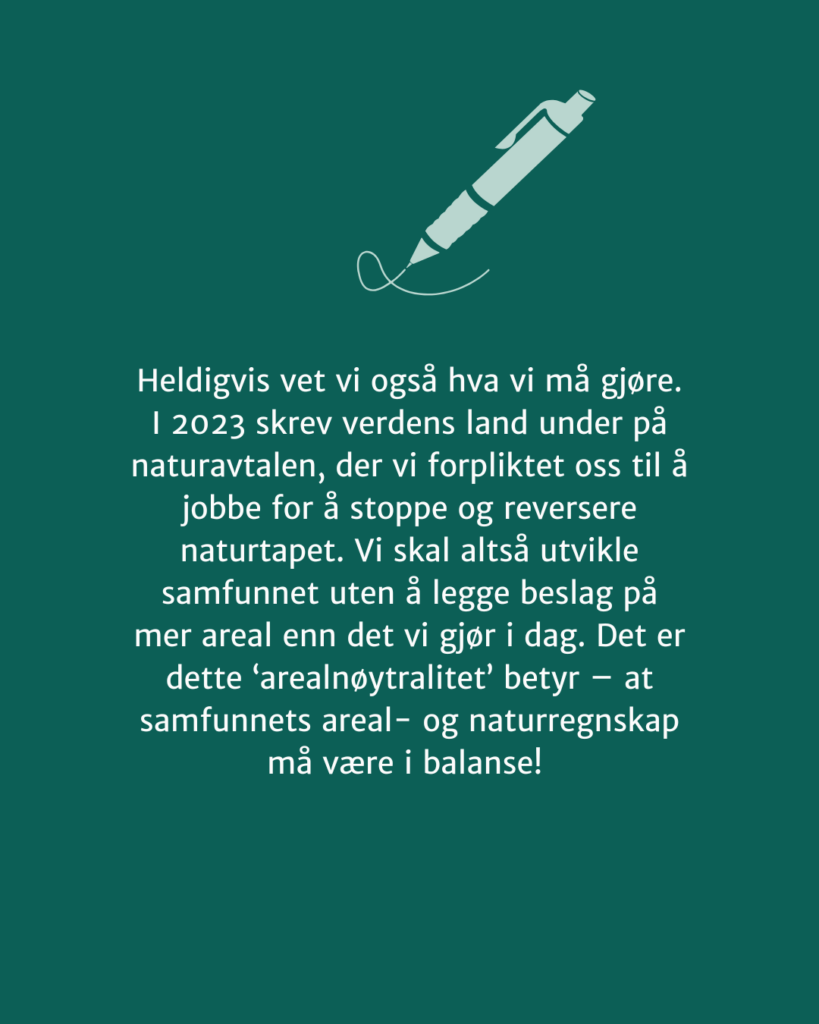 Heldigvis vet vi også hva vi må gjøre. I 2023 skrev verdens land under på naturavtalen, der vi forpliktet oss til å jobbe for å stoppe og reversere naturtapet. Vi skal altså utvikle samfunnet uten å legge beslag på mer areal enn det vi gjør i dag. Det er dette ‘arealnøytralitet’ betyr – t samfunnets areal- og naturregnskap må være i balanse! Avtalen bygger på kunnskap fra FNs naturpanel, og utgjør en kunnskapsbasert oppskrift på hvordan landene må jobbe for å nå naturmålene. En viktig lærdom fra dette arbeidet er at vi må slutte å se på naturen som en særinteresse. Naturhensyn må inn i all politikk, og vi må ta naturhensyn i all arealforvaltning. Dette vet vi.