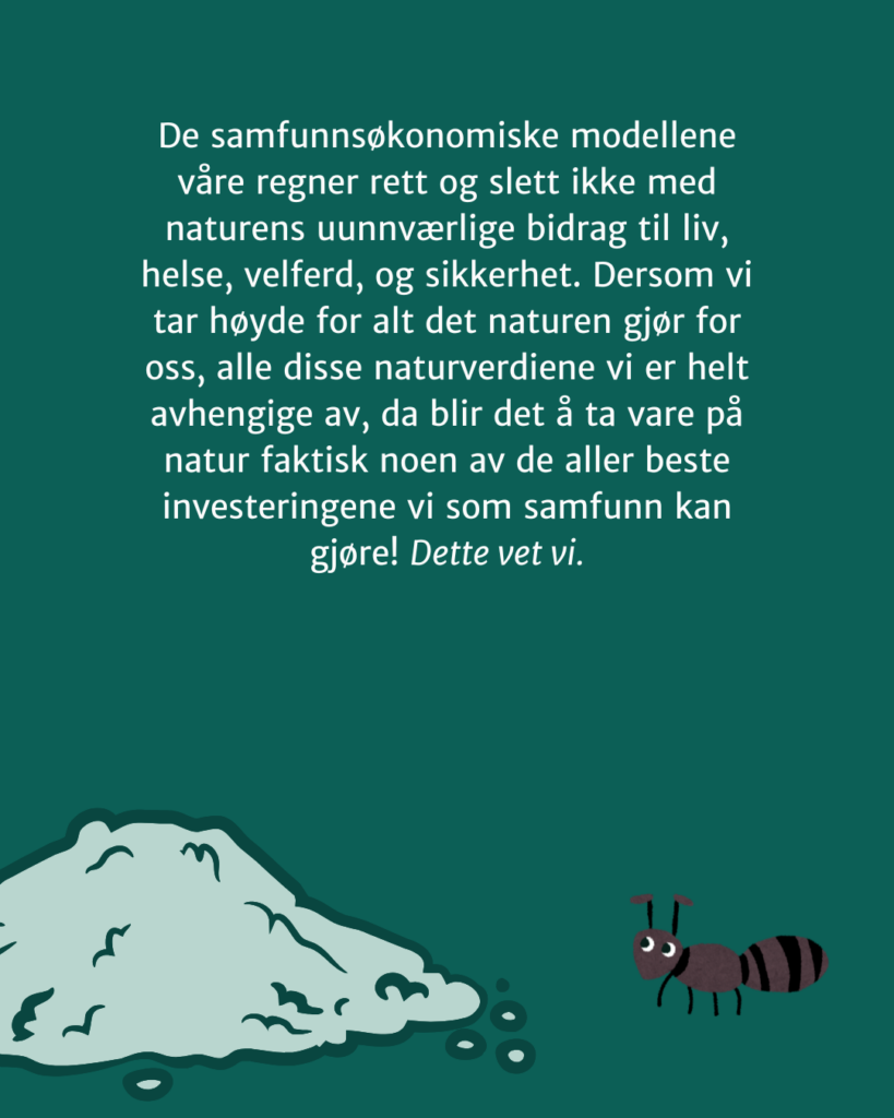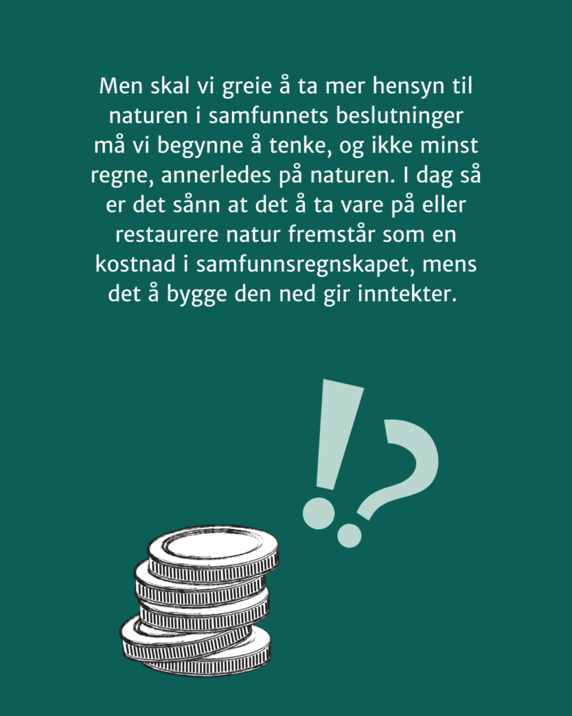 Men skal vi greie å ta mer hensyn til naturen i samfunnets beslutninger må vi begynne å tenke, og ikke minst regne, annerledes på naturen. I dag så er det sånn at det å ta vare på eller restaurere natur fremstår som en kostnad i samfunnsregnskapet, mens det å bygge den ned gir inntekter. De samfunnsøkonomiske modellene våre regner rett og slett ikke med naturens uunnværlige bidrag til liv, helse, velferd, og sikkerhet. Dersom vi tar høyde for alt det naturen gjør for oss, alle disse naturverdiene vi er helt avhengige av, da blir det å ta vare på natur faktisk noen av de aller beste investeringene vi som samfunn kan gjøre! Dette vet vi.