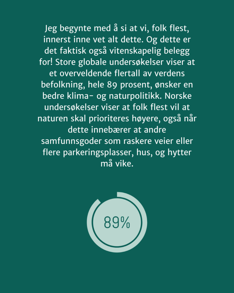 Jeg begynte med å si at vi, folk flest, innerst inne vet alt dette. Og dette er det faktisk også vitenskapelig belegg for! Store globale undersøkelser viser at et overveldende flertall av verdens befolkning, hele 89 prosent, ønsker en bedre klima- og naturpolitikk. Norske undersøkelser viser at folk flest vil at naturen skal prioriteres høyere, også når dette innebærer at andre samfunnsgoder som raskere veier eller flere parkeringsplasser, hus, og hytter må vike.