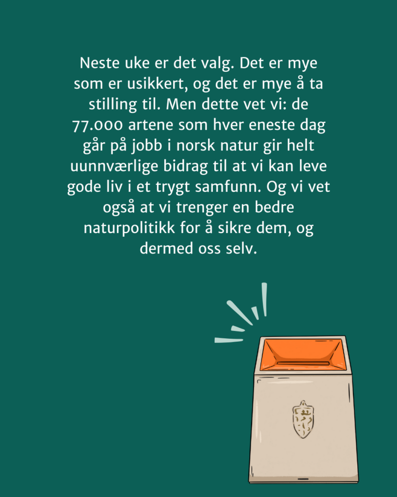 Neste uke er det valg. Det er mye som er usikkert, og det er mye å ta stilling til. Men dette vet vi: de 77.000 artene som hver eneste dag går på jobb i norsk natur gir helt uunnværlige bidrag til at vi kan leve gode liv i et trygt samfunn. Og vi vet også at vi trenger en bedre naturpolitikk for å sikre dem, og dermed oss selv.