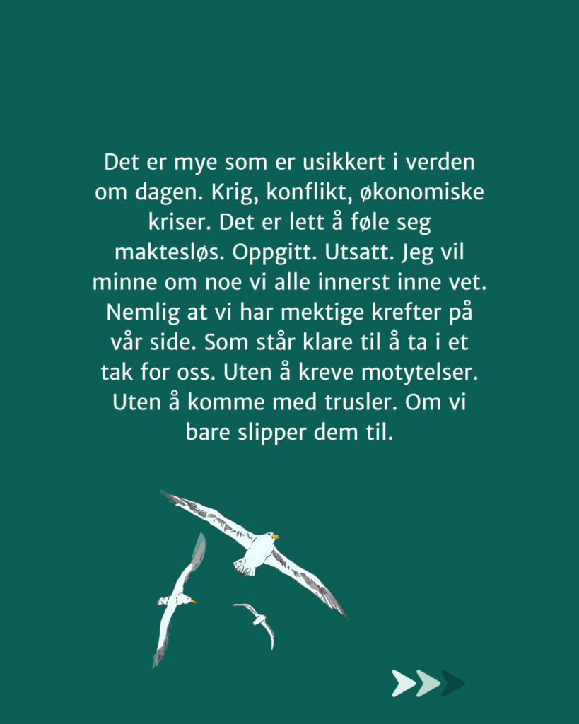 Det er mye som er usikkert i verden om dagen. Krig, konflikt, økonomiske kriser. Det er lett å føle seg maktesløs. Oppgitt. Utsatt. Jeg vil minne om noe vi alle innerst inne vet. Nemlig at vi har mektige krefter på vår side. Som står klare til å ta i et tak for oss. Uten å kreve motytelser. Uten å komme med trusler. Om vi bare slipper dem til.