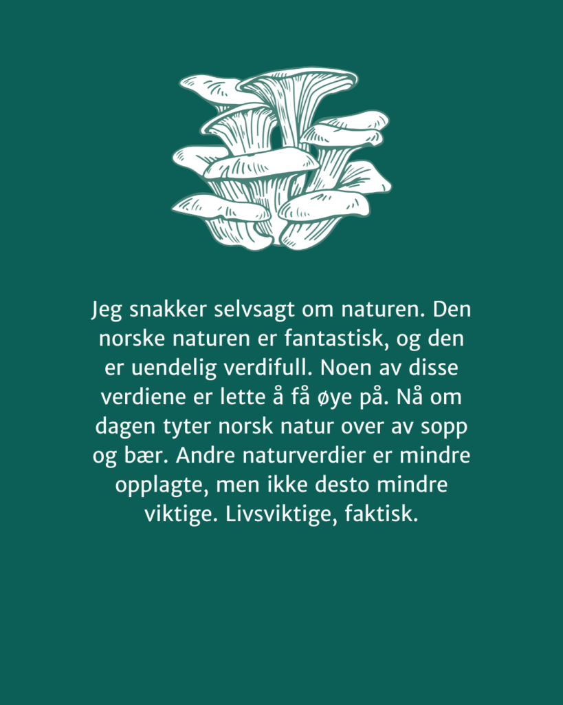 Jeg snakker selvsagt om naturen. Den norske naturen er fantastisk, og den er uendelig verdifull. Noen av disse verdiene er lette å få øye på. Nå om dagen tyter norsk natur over av sopp og bær. Andre naturverdier er mindre opplagte, men ikke desto mindre viktige. Livsviktige, faktisk.