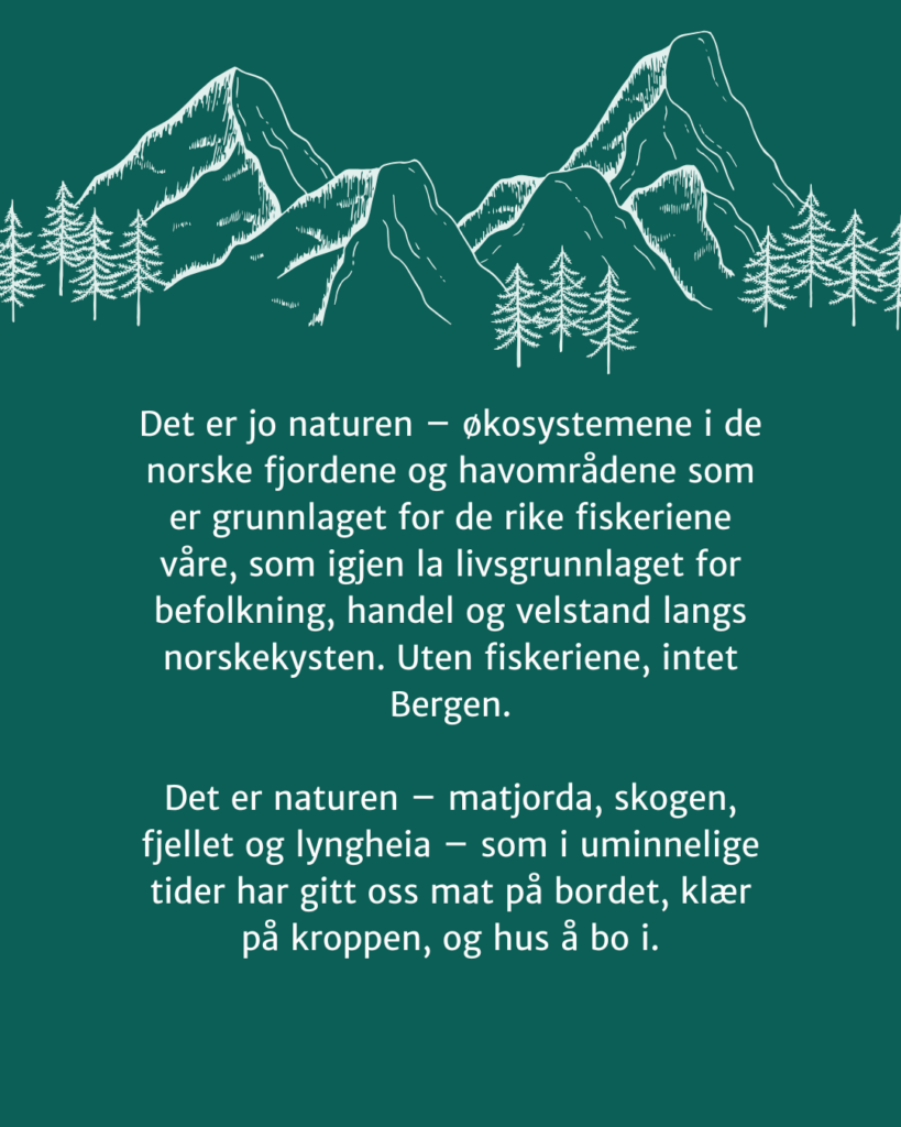 Det er jo naturen – økosystemene i de norske fjordene og havområdene som er grunnlaget for de rike fiskeriene våre, som igjen la livsgrunnlaget for befolkning, handel og velstand langs norskekysten. Uten fiskeriene, intet Bergen.