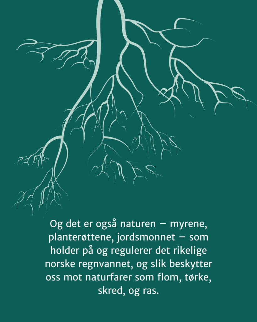 Og det er også naturen – myrene, planterøttene, jordsmonnet – som holder på og regulerer det rikelige norske regnvannet, og slik beskytter oss mot naturfarer som flom, tørke, skred, og ras.