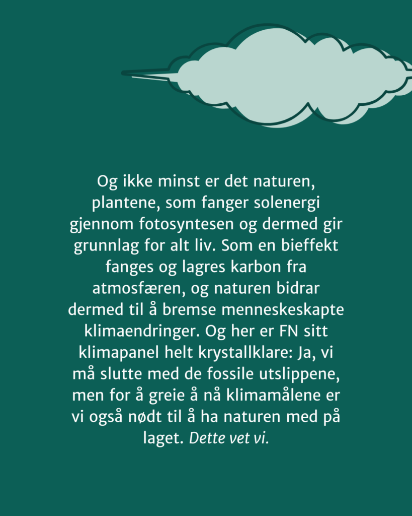 Og ikke minst er det naturen, plantene, som fanger solenergi gjennom fotosyntesen og dermed gir grunnlag for alt liv. Som en bieffekt fanges og lagres karbon fra atmosfæren, og naturen bidrar dermed til å bremse menneskeskapte klimaendringer. Og her er FN sitt klimapanel helt krystallklare: Ja, vi må slutte med de fossile utslippene, men for å greie å nå klimamålene er vi også nødt til å ha naturen med på laget. Dette vet vi.