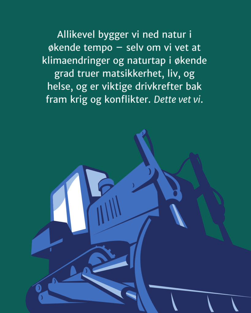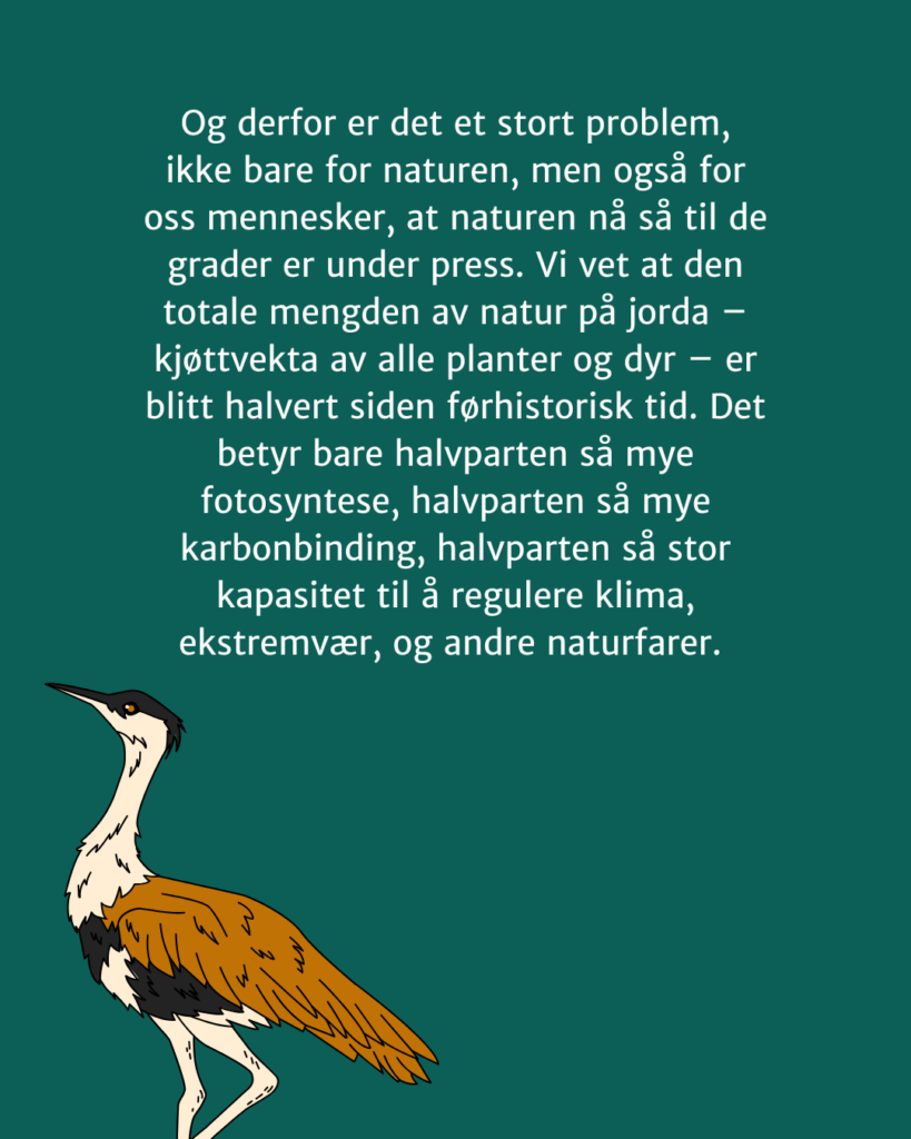 Og derfor er det et stort problem, ikke bare for naturen, men også for oss mennesker, at naturen nå så til de grader er under press. Vi vet at den totale mengden av natur på jorda – kjøttvekta av alle planter og dyr – er blitt halvert siden førhistorisk tid . Det betyr bare halvparten så mye fotosyntese, halvparten så mye karbonbinding, halvparten så stor kapasitet til å regulere klima, ekstremvær, og andre naturfarer. Allikevel bygger vi ned natur i økende tempo – selv om vi vet at klimaendringer og naturtap i økende grad truer matsikkerhet, liv, og helse, og er viktige drivkrefter bak fram krig og konflikter. Dette vet vi.