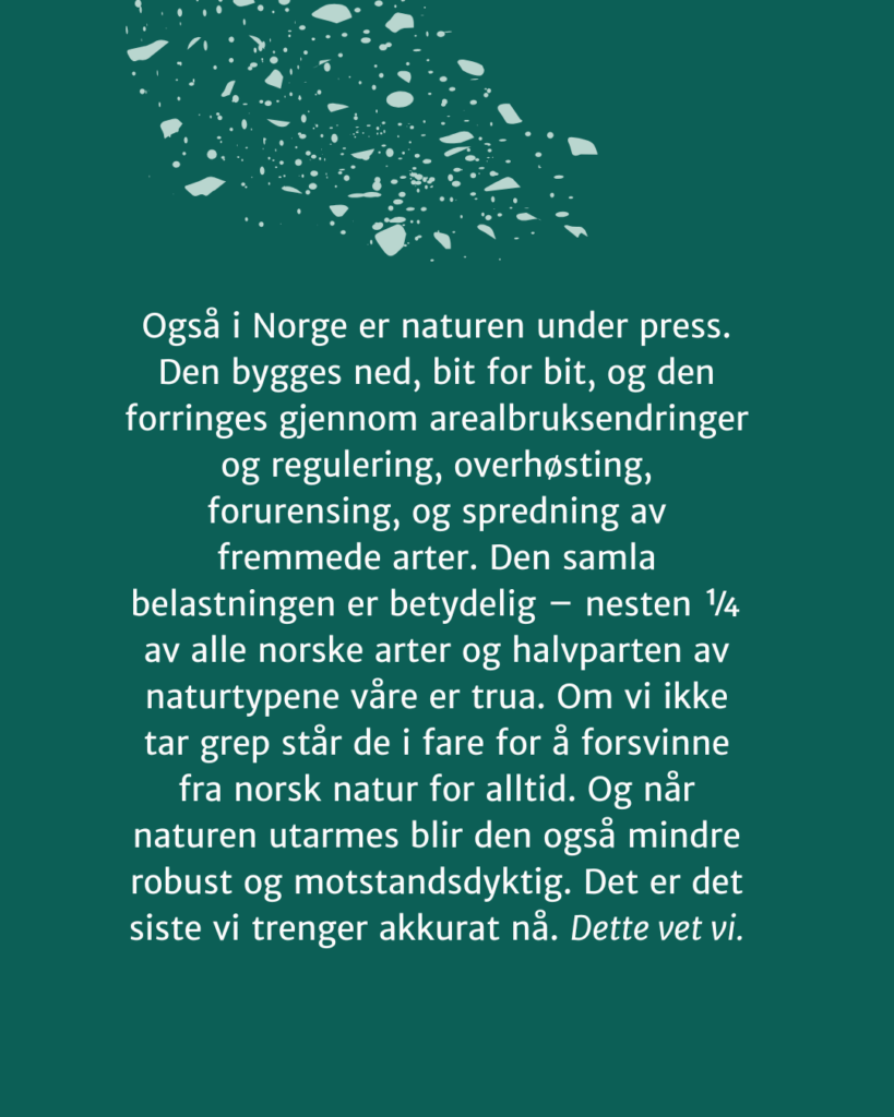 Også i Norge er naturen under press. Den bygges ned, bit for bit, og den forringes gjennom arealbruksendringer og regulering, overhøsting, forurensing, og spredning av fremmede arter. Den samla belastningen er betydelig – nesten ¼ av alle norske arter og halvparten av naturtypene våre er trua. Om vi ikke tar grep står de i fare for å forsvinne fra norsk natur for alltid. Og når naturen utarmes blir den også mindre robust og motstandsdyktig. Det er det siste vi trenger akkurat nå. Dette vet vi.
