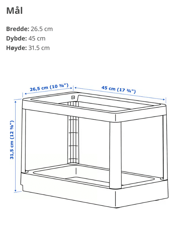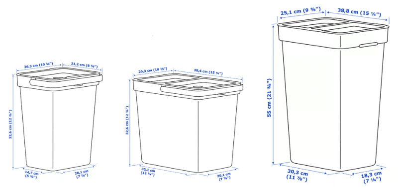 De smarte søppelbøttene og vekt-delen er av IKEA-typen Hållbar. Hvis du allerede har slike søppelbøtter, eller andre søppelbøtte(r) som passer inn i målene til vekt-delen (over), kan du gjerne bruke dine egne bøtter. Da mottar du i så fall bare vekt-delen(e).