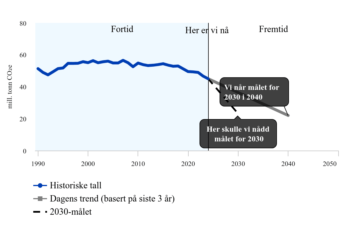 • Vi mangler de store endringene. Klimapolitikken gir ikke de varige løsningene vi trenger for å nå målet om et lavutslippssamfunn i 2050.