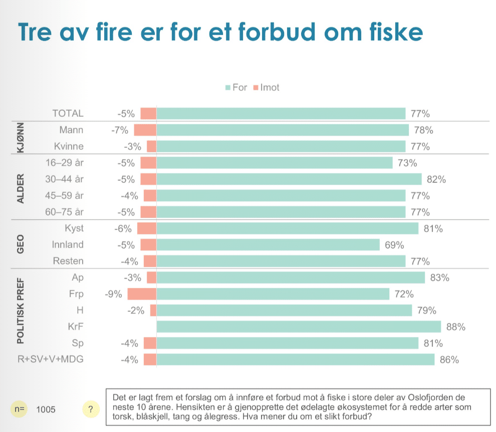 En stor, representativ opinionsundersøkelse i mars 2025 viste at et stort flertall av befolkningen både i Norge og i kystkommunene rundt Oslofjorden er for å innføre et forbud mot å fiske i store deler av Oslofjorden de neste 10 årene, med hensikten å gjenopprette det ødelagte økosystemet for å redde arter som torsk. Kun 5% var mot.