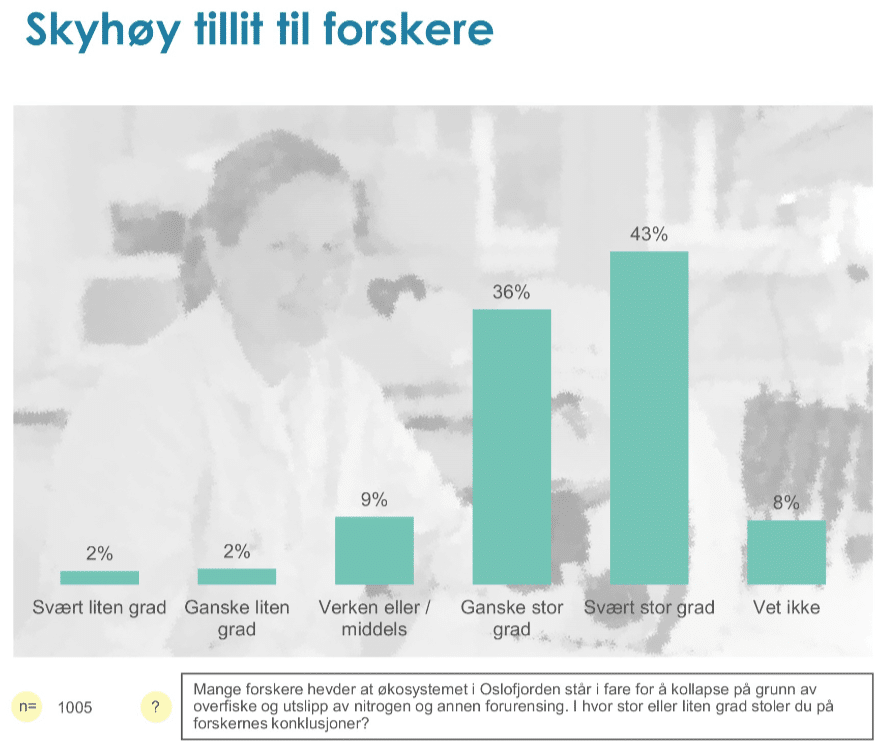Et stort flertall stoler også på forskernes konklusjoner om at økosystemet i Oslofjorden ellers står i fare for å kollapse på grunn av overfiske og utslipp av nitrogen og annen forurensing.