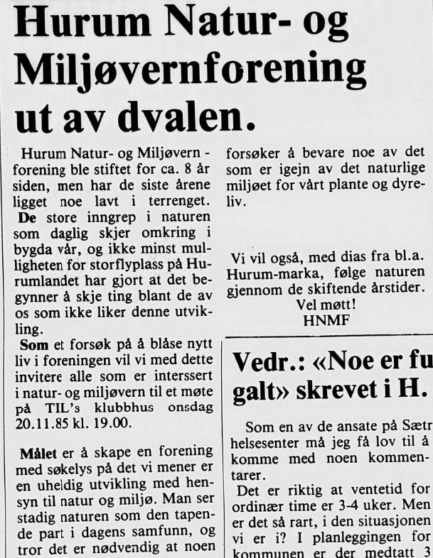 Hurum Natur- og miljøvernforening ble stifta 20. november 1985. Det var først og fremst planene om ny hovedflyplass på Hurum som satte fart i sakene, og som skulle komme til å bli lagets fremste kampsak de kommende årene, helt fram til Stortinget den 1. juni 1990 vedtok å avslutte utredninga av hovedflyplass på Hurum, og i stedet utrede en ny flyplass på Gardermoen.