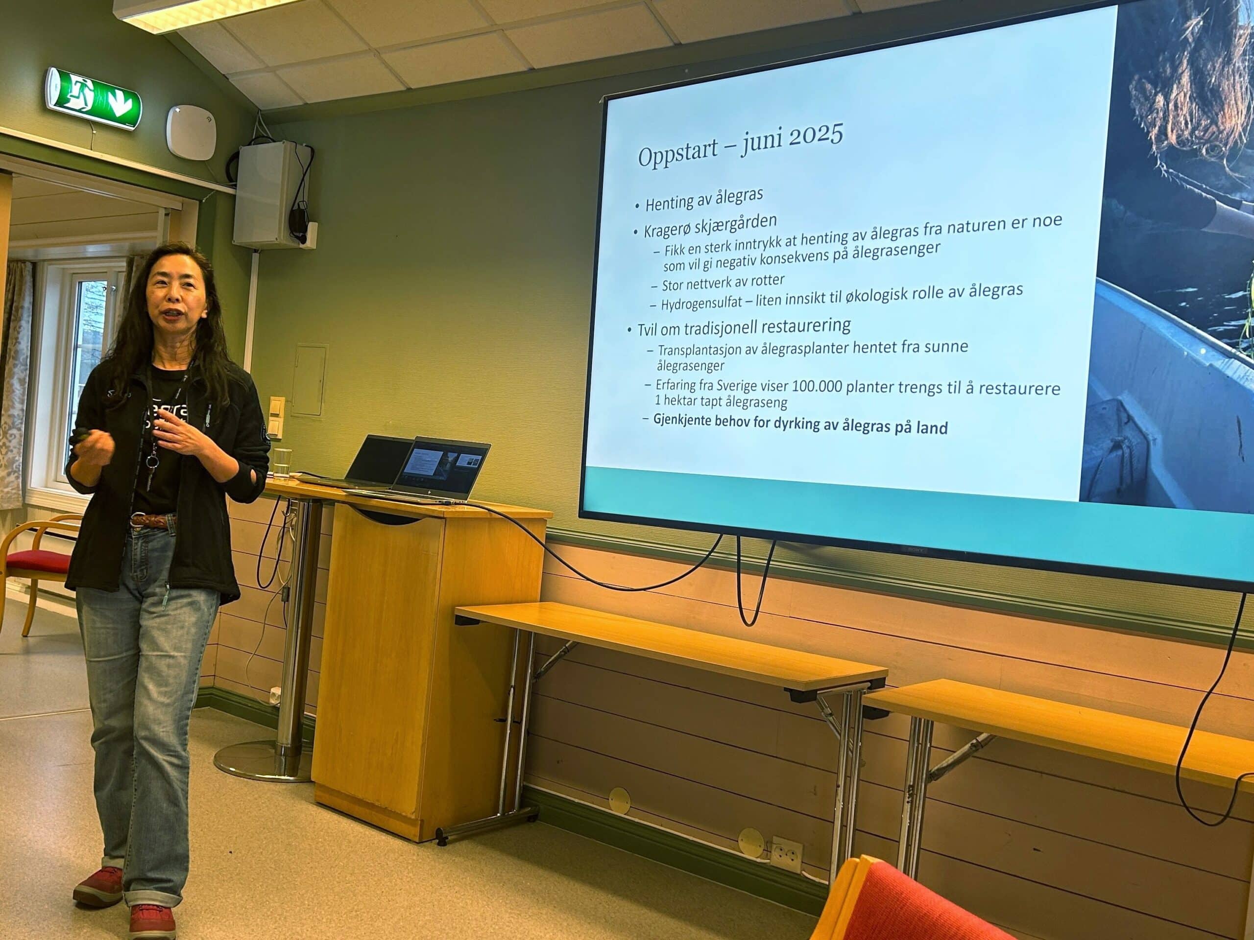 Martine StaveIkumi Umetani fra NIBIO er en av de som jobber med oppformeringen av ålegras på Landvik. Hun holdt et spennende innlegg om arbeidet de har gjort til nå, og vi fikk vite mer om både metodene for innhøsting av frø og stiklinger, samt litt om utfordringene de har hatt underveis i prosjektet og hvordan de har løst dem. Grunnen til at vi ønsker å oppformere ålegras fremfor å hente donorplanter eller frø fra andre enger, er at vi sparer de friske ålegrasengene fra belastning og samtidig unngår å bruke dykkere i alle ledd av arbeidet. Bare siden i sommer har de løst mange floker og har gjort en imponerende innsats!