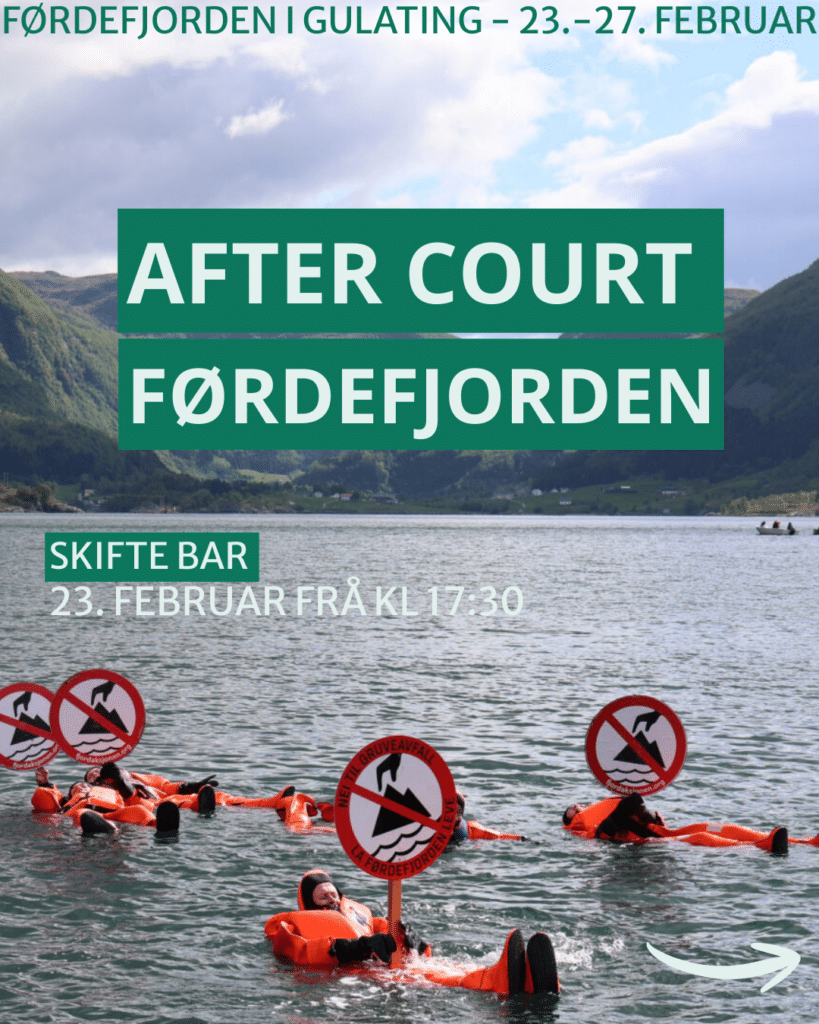 Naturvernforbundet og Natur og Ungdom inviterer til «after court» med konsert, samtalar og basar for Førdefjorden i Skifte bar på det Vestnorske teateret.