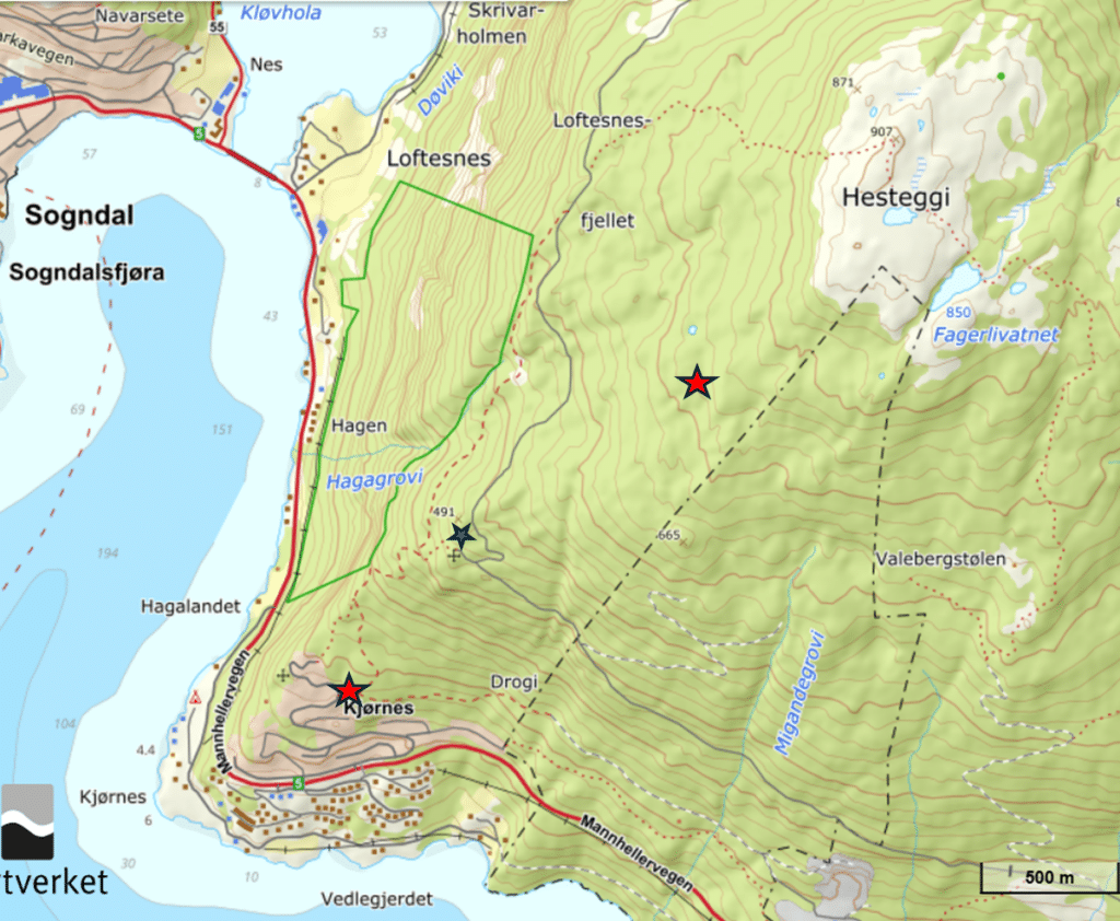 Parkering (og start) ved den nederste røde stjerna. Derfra følger vi sti opp til “masta” (liten blå stjerne) på skogsbilvei eit lite stykke før vi går ut i terrenget og opp til den øverste røde stjerna. Då er vi oppi høgareliggande storvokst, gammal furuskog. Her tar vi ein lunsjpause (matpakke). Etter lunsj, går vi nordover i terrenget, holder 700 høgdemeter nesten fram til stien til Hesteggi. Den stien følger vi tilbake til parkeringa.