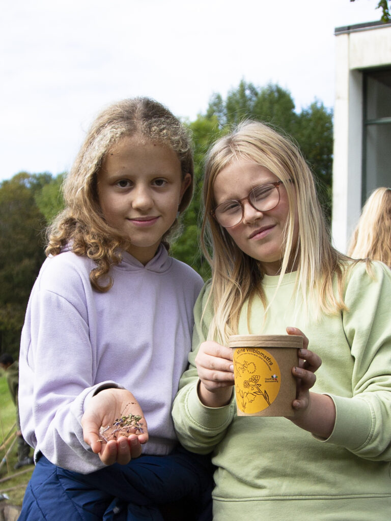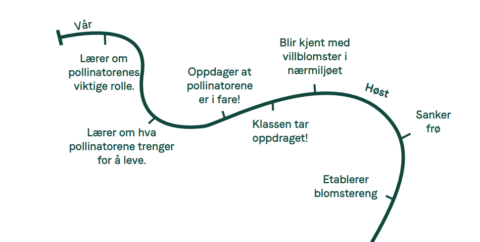Inne: bli kjende med pollinatorane og villblomstrane, brett frøposar, planlegg blomsterenga, sorter/frø, arbeid med oppgåveark og elevhefte.
