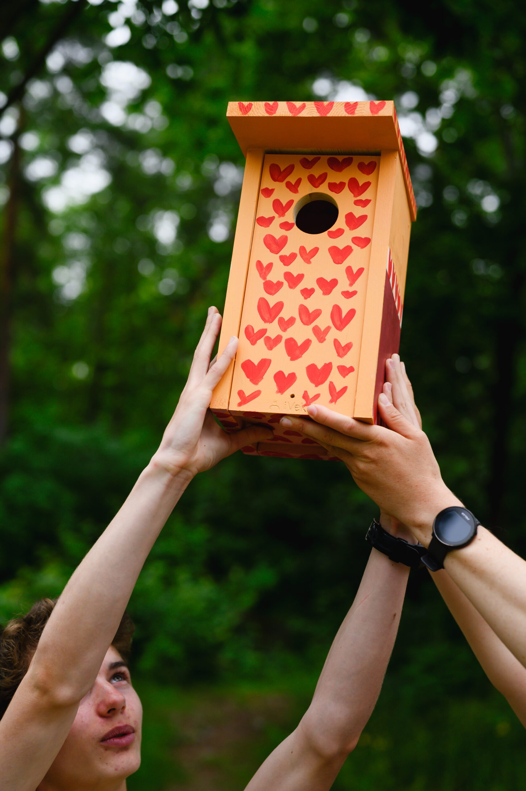 En gutt som viser frem en ferdigbygd fuglekasse. Foto: Fartein Rudjord Foto: Fartein Rudjord