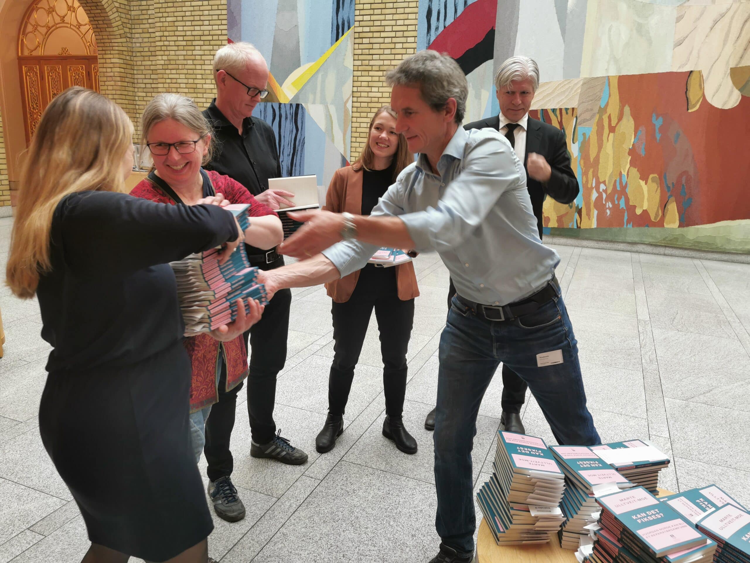 Truls Gulowsen, leder i Naturvernforbundet, overrekker Marte Ulltveit-Moes reparasjonsbok til Mathilde Tybring-Gjedde (H), Lars Haltbrekken (SV), Une Aina Bastholm (MdG) og Ola Elvestuen (V). Foto: Tor Bjarne Christensen