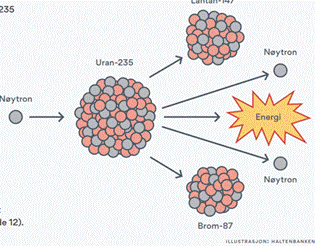 Den grunnleggende prosessen er at når et nøytron bombarderer et uranatom (U-235) spaltes uranet i to andre radioaktive atomer, samtidig som det frigjøres store mengder energi.