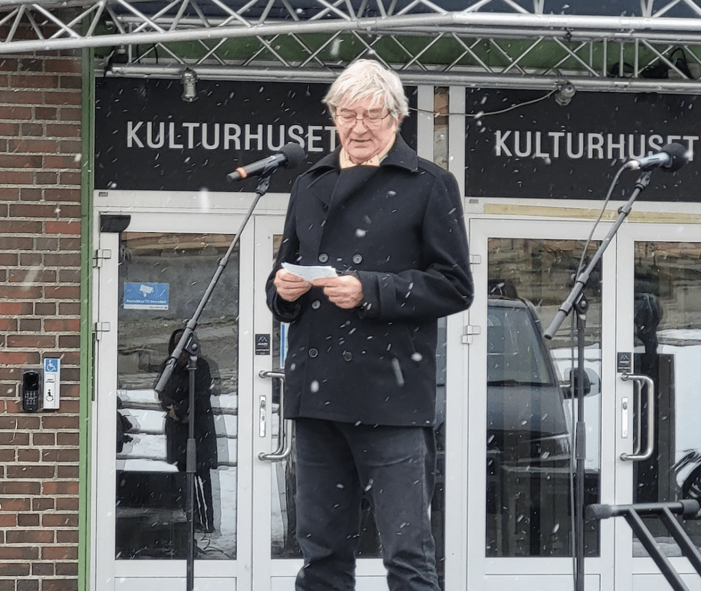Ivar Bjørklund på podiet under en demonstrasjon i Tromsø mot elektrifisering av Melkøya 3. mai 2025. Foto: Ingunn Elstad