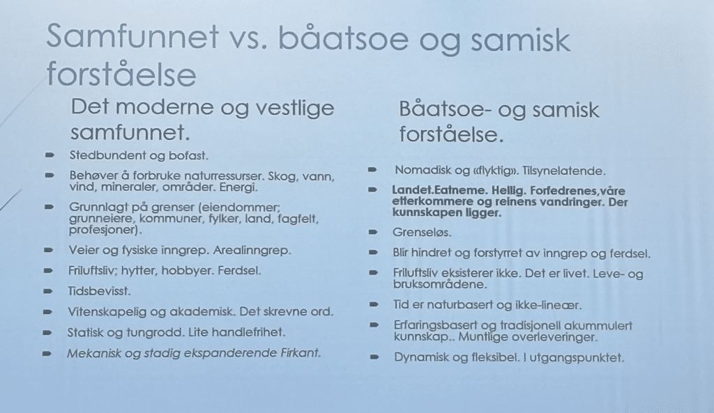 Det norske og vestlige samfunnet er veldig grensebevisst, påpeker Danielsen, og trekker frem at det samiske perspektivet er mer grenseløst. Oversikten under oppsummerer det ulike tankesettet.