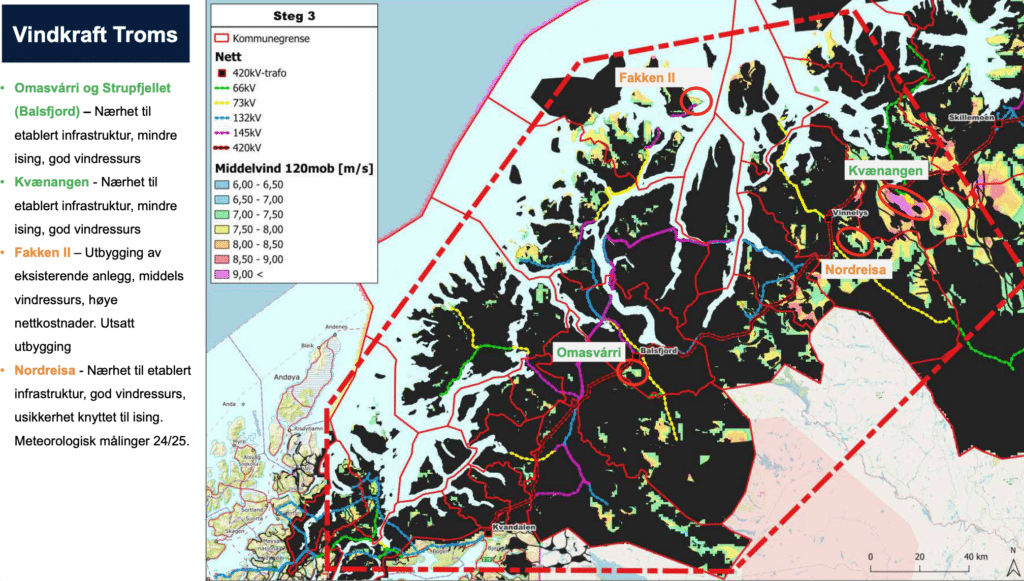 Nordreisa: Her viste mulighetsstudien at det er usikkerhet knyttet til ising i det området vi kom fram til. Her er det igangsatt meteorologisk målinger for å avklare om området er teknisk egnet eller ikke.