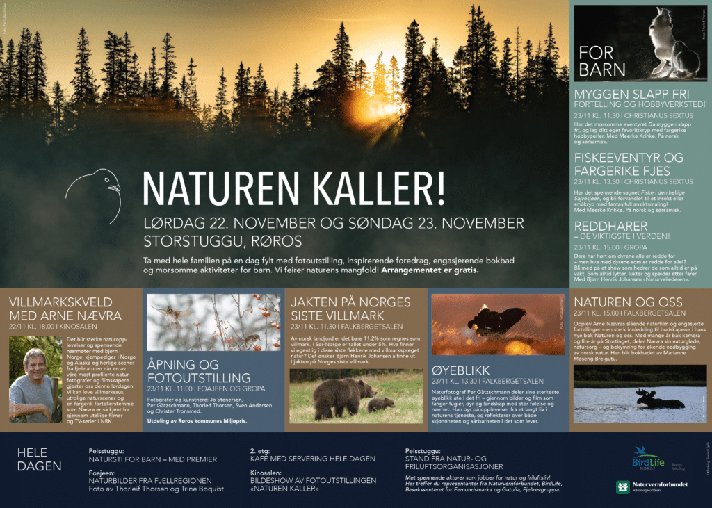 Velkommen til Naturen kaller – en helg der vi feirer naturens mangfold med bilder, foredrag og opplevelser for alle aldre. Storstuggu fylles med fotoutstilling, engasjerende foredrag, bokbad, stands, barneaktiviteter og hyggelig kaféstemning. Arrangementet er gratis og åpent for alle.
