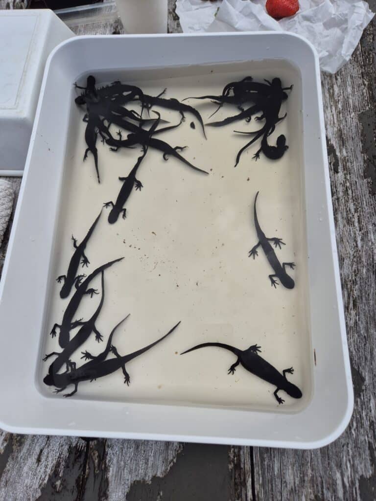 Morten HarperDe som møtte opp fikk være med på å ta opp feller som vi hadde plassert i tjønna dagen før. Totalt fanget vi 78 salamandre med 15 utlagte feller. Etter opptak og opptelling ble salamanderne målt og veid og fotografert før de ble sluppet ut i tjønna igjen.