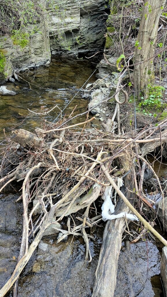 Roar JulsethBildet under viser en vase av grener og søppel som er fanget av en kabel som har nådd vannstrømmen i bekken under stor vannføring. Dette bør personell fra Stjørdal kommune ta seg av før kabelen slites i stykker av trykket fra vannstrømmen. Ingen av oss har noen formening om hva slags kabel dette er eller om den er i bruk/virksom: