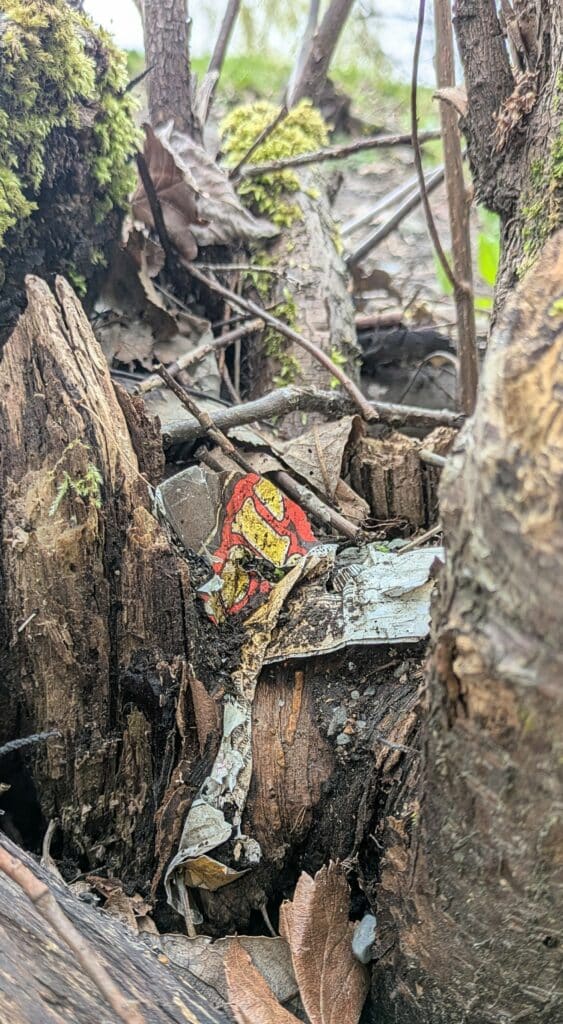 På første bilde har plastemballasjen ligget fast i treet så lenge at det er grodd inn i treverket og dermed umulig å få løs: