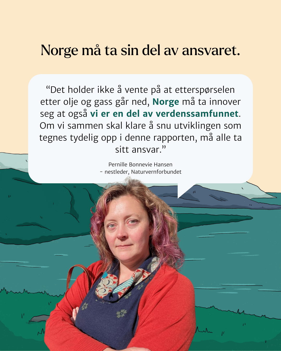 – Vi kan ikke fortsette å leve i en alternativ virkelighet her på berget, der vi fortsetter å lete etter mer olje og gass, samtidig som vi framhever oss selv som et foregangsland internasjonalt. Det holder ikke å vente på at etterspørselen etter olje og gass går ned, Norge ta innover seg at også vi er en del av verdenssamfunnet. Om vi sammen skal klare å snu utviklingen som tegnes tydelig opp i denne rapporten, må alle ta sitt ansvar, sier Pernille Bonnevie Hansen, nestleder i Naturvernforbundet.